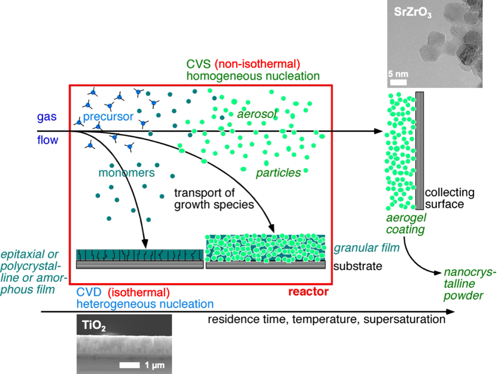 The major limitation of the CVS process is the availability of appropriate precursor materials. Both in CVD and CVS, precursors are metalorganics, carbonyls, hydrides, chlorides and other volatile compounds in gaseous, liquid or solid state. The energy for the conversion of the reactants into nanoparticles is supplied in hot wall (external furnace), flame (reaction enthalpy), plasma (microwave or radio frequency) and laser (photolysis or pyrolysis) reactors. Chemical Vapor Reaction (CVR), Chemical Vapor Condensation (CVC), Chemical Vapor Precipitation (CVP) are synonyma used frequently in the literature. The most important process parameters determining the quality and usability of the nanopowders are the total pressure (typical range from 100 to 100000 Pa), the precursor material (decomposition kinetics and ligands determining the impurity level), the partial pressure of the precursor (determining the production rate and particle size), the temperature or power of the energy source, the carrier gas (mass flow determining the residence time) and the reactor geometry. The nanoparticles are extracted from the aerosol by means of filters, thermophoretic collectors, electrostatic precipitators or scrubbing in a liquid. A typical laboratory reactor consists of a precursor delivery system, a reaction zone, a particle collector and a pumping system. Modifications of the precursor delivery system and the reaction zone allow the synthesis of pure oxides, doped oxides, coated nanoparticles, functionalized nanoparticles and granular films.